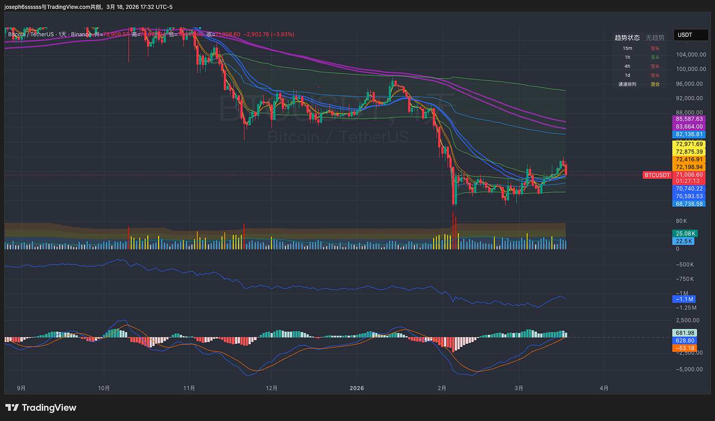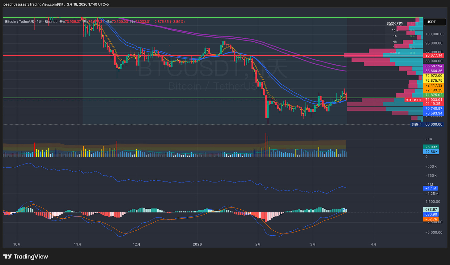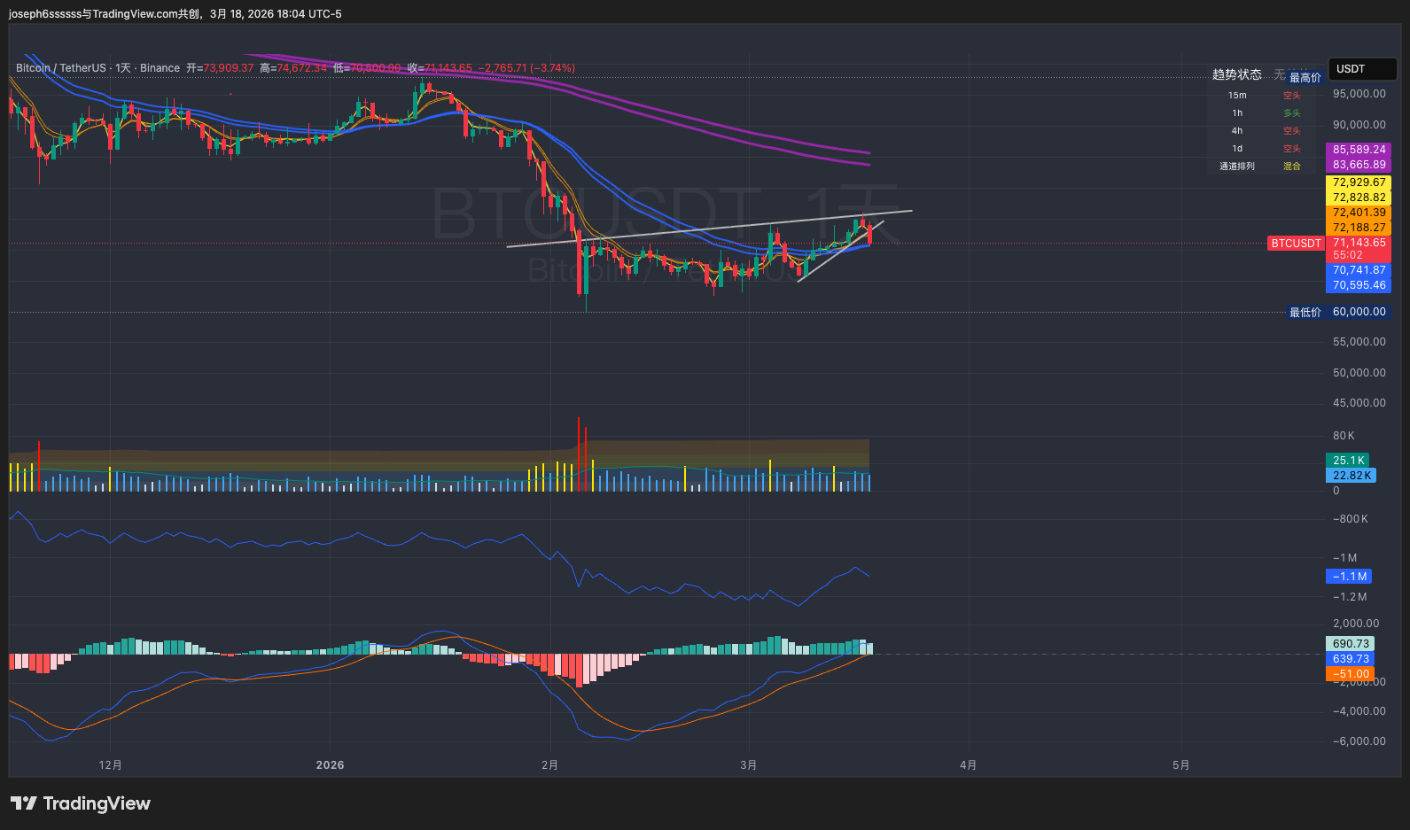 不过今早伊朗局势升级导致的油价上涨和BTC下跌,使得BTC已经跌破了这一周以来的强势上涨趋势(cao)。现在在70500盘整区间上沿和4h维加斯通道获得短暂支撑。这里目前是多头的最后一道防线,跌破7w基本上宣告反弹结束,目标下方的60k low, 前区间的下沿。这里的价格反应将直接决定后续的走势。