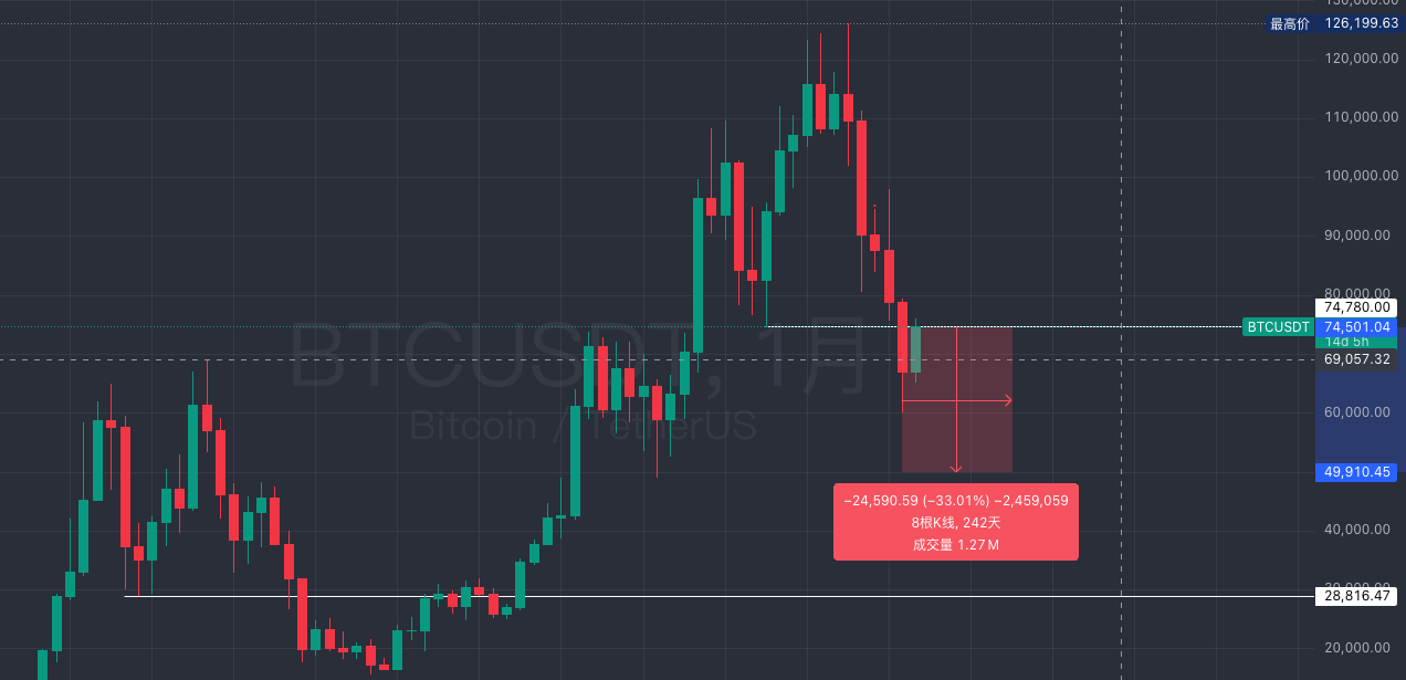 2月的大跌,break了自从23年以来的monthly structure。BTC从10月做顶开始出现了极为少见的连续五个月下跌。最大跌幅高达50%。BTC上一次break monthly structure是2022年的6月。22年6月跌破顶部结构后,继续下跌了40%,并花了273天才形成并走出这个底部区间。即使不算FTX暴雷后的底部,MSB后也有35%的跌幅。