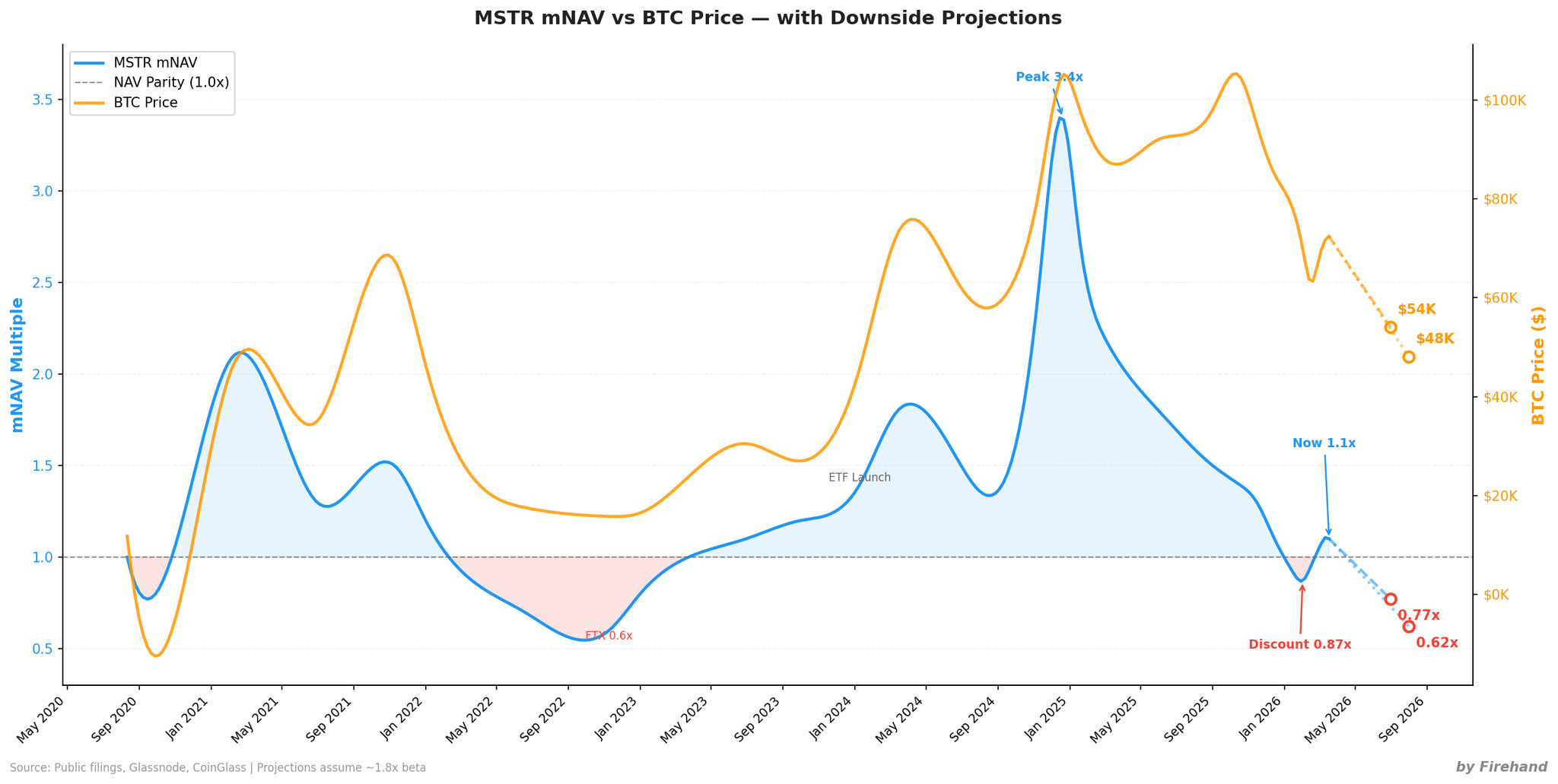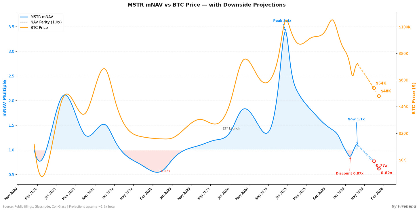 不止技术面的刻舟求剑,BTC的重要筹码数据也支撑了这一区间。2月跌到60k的时候,MSTR的mnav本轮首次跌破1,到达0.8,呈现负溢价。历史上MSTR mnav跌破1都是底部区间出现的信号。22年FTX暴雷后,MSTR mnav最低跌至0.6x,标记了22年的大底。如果本轮继续下跌,跌至54k时mnav为0.77,而跌至48k时,mnav将追平22年底部的0.6x。因此这个区间将是理论上性价比极高的长期建仓点位。考虑到MSTR mnav与价格的背离在25年10月时,如21年底一般,成功标记了周期顶部,我认为其数据在底部也能继续有效,对抄底提供参考。
