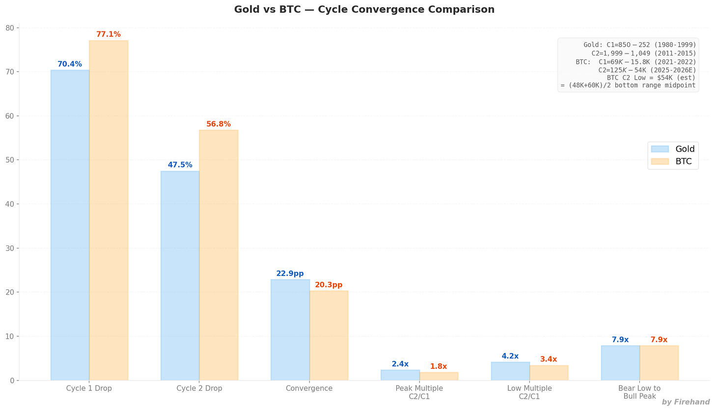 有趣的是,BTC作为“数字黄金”,虽然与黄金的周期并不同频,但两者的周期性价格走势有着出乎意料的共通点。当我们取假设的底部区间中轴54k作为输入数据,我们惊讶的发现黄金和BTC在两轮熊市走势中的变化几乎相同:跌幅类似,跌幅收敛类似,周期涨幅类似。虽然是无心发现的pattern,但如果你认可BTC有着同黄金类似的周期属性,那或许这一数据也可以提供一些共振。